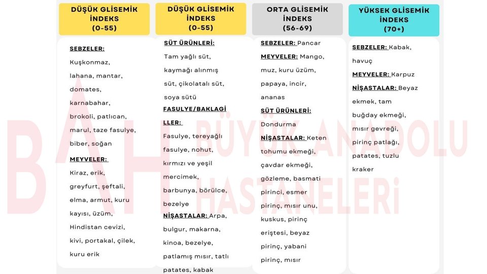 Besinlerin glisemik indeks tablosu aşağıdaki gibidir: