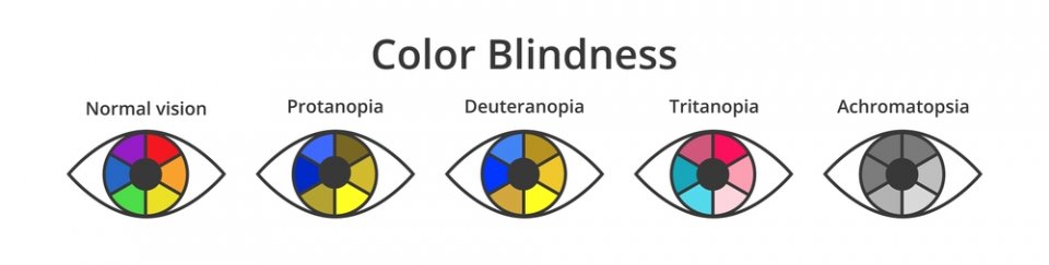 Renk körlüğünün çeşitli türleri vardır ve her biri farklı renk ayrım problemlerine yol açar. En yaygın tip olan red-green color blindness (kırmızı-yeşil renk körlüğü) bireyin kırmızı ve yeşil tonları ayırt etmekte zorlandığı bir durumdur. Bir başka tür olan mavi-sarı renk körlüğü ise mavi ve sarı tonlarını ayırt etme yeteneğini etkiler. Nadiren görülen monokromatizm adlı durumda ise birey sadece siyah, beyaz ve gri tonları görebilir.